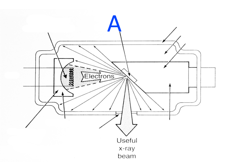 1) Identify the structure indicated by the arrow marked “A” in this x-ray tube and which material is it made it from? (1 mark)