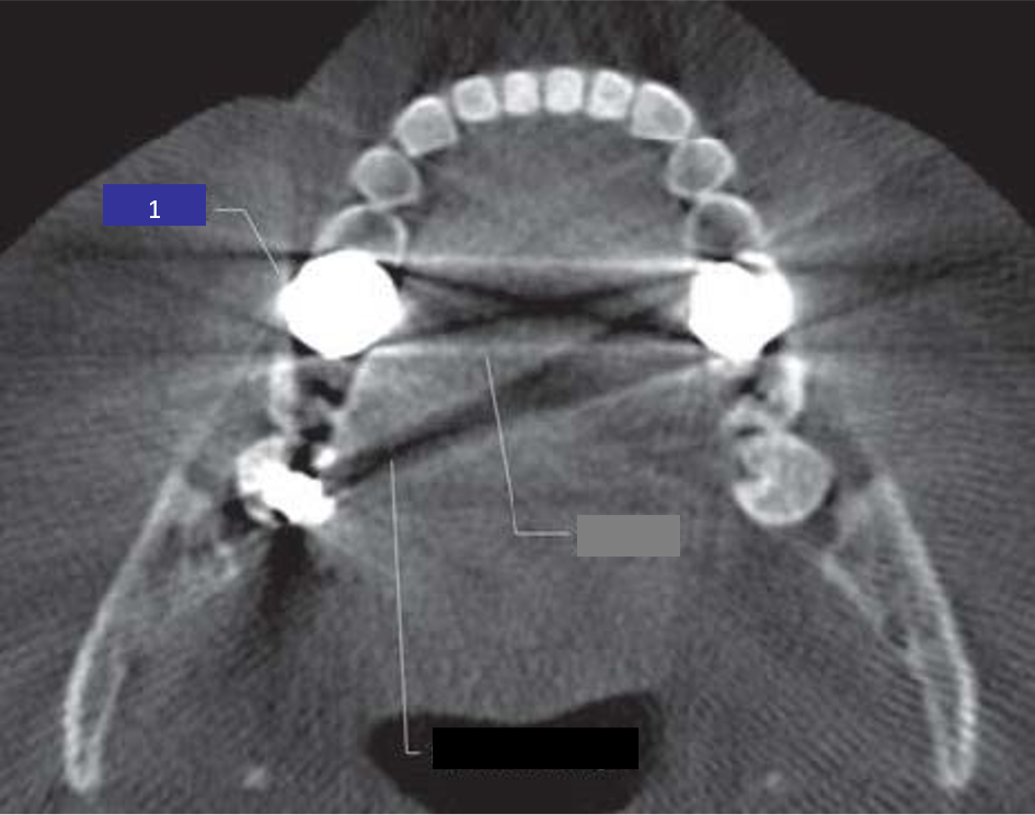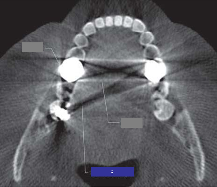 35) Identify the cone beam artifact indicated by 1 in this image? (1 mark)